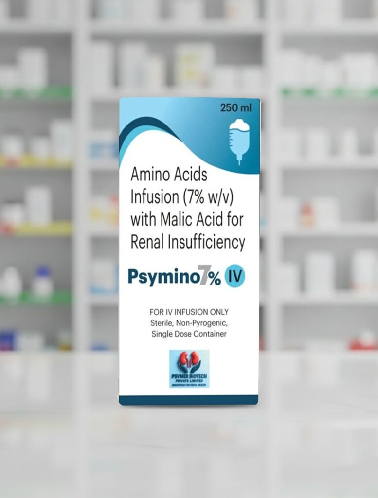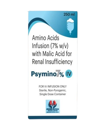 Psymino 7% IV is a sterile amino acid infusion specially formulated for patients with renal insufficiency to support protein nutrition and metabolic balance.